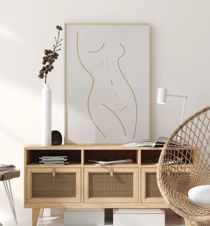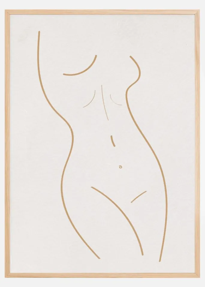 En livstegningsplakat af en kvinde i brune linjer. Stærke, kraftige brune linjer skitserer kvindens ben, mave og bryst. Linjerne er glatte og flyder opad i denne elegante actiontegning. Hæng den op på en enkel hvid væg for at få galleri-følelsen.