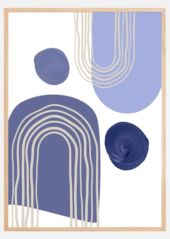 Plakaten er en leg med form og perspektiv, hvor de beige linjer mod den lysere lilla baggrund tilbyder en illusion af dybde og bevægelse. To individuelle cirkulære figurer i samme mørkeblå farve som det store motiv, en ved øverste kant og den anden nederst til højre, balancerer kompositionen. Farvepaletten i denne plakat er begrænset men effektfuld, bestående af forskellige toner af blå og lilla samt beige, der skaber en afslappet, men alligevel iøjnefaldende æstetik. Det er et print, der uden tvivl ville blive en samtalestarter i ethvert moderne hjem eller kontor, hvor den end placeres.