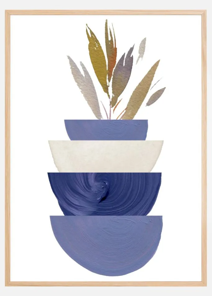 Fra den øvre skåls midte rejser der sig abstrakte former, der minder om løv eller fjer, malet i naturlige farver såsom olivengrøn, rustbrun, grå og beige. De organiske former sammen med de geometriske skåle skaber en unik kontrast, som er både øjenfaldende og tankevækkende. Dette print kombinerer elementer af natur og design på en måde, der fanger essensen af en moderne bohemisk stil, med en farvepalet, der indeholder både jordnære toner og kølige blå nuancer. Plakaten tilbyder en elegant og stilfuld detalje for hvert rum, uanset om det er en stue, soveværelse eller kontor.