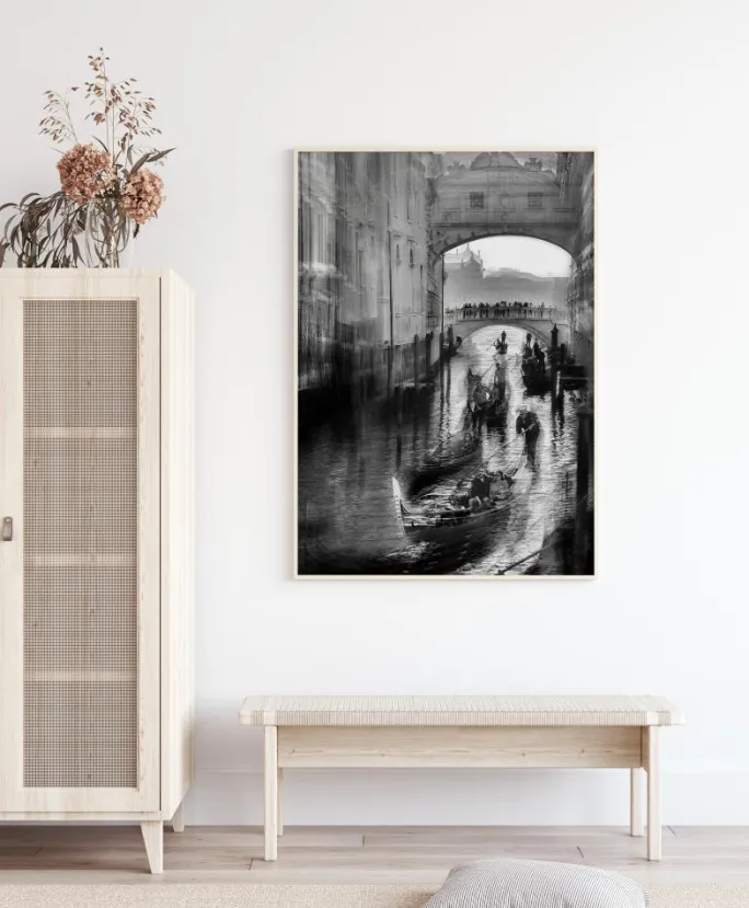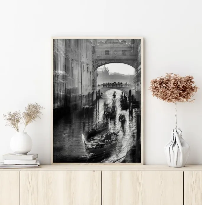 En klassisk plakat med motiv af en bro i Venedig. Følg gondolernes vej, mens de sejler gennem den rolige kanal. Rejs på eventyr hjemmefra med denne maleriske plakat.