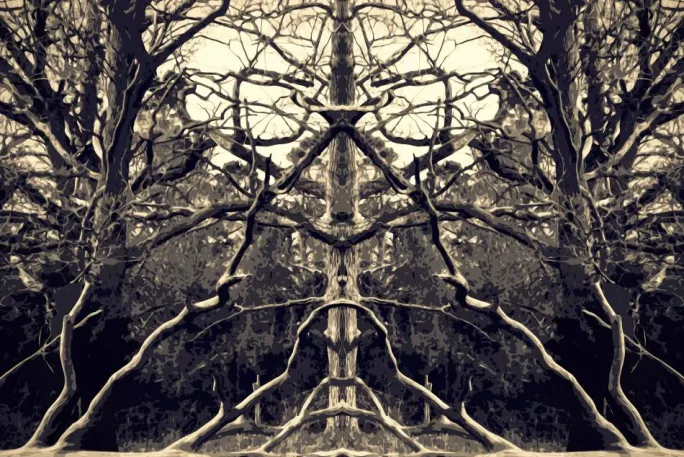 En fantastisk kalejdoskopisk plakat af træer og deres grene. Spejlbilledet i dette billede giver en fascinerende plakat, hvor du kan se alle mulige ansigter og former. De lyse sepia-toner på denne plakat passer godt sammen med pastelfarver for at skabe en blødere stemning, der står i kontrast til billedets kompleksitet.