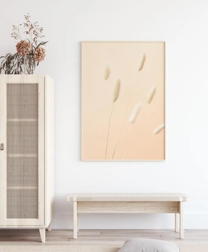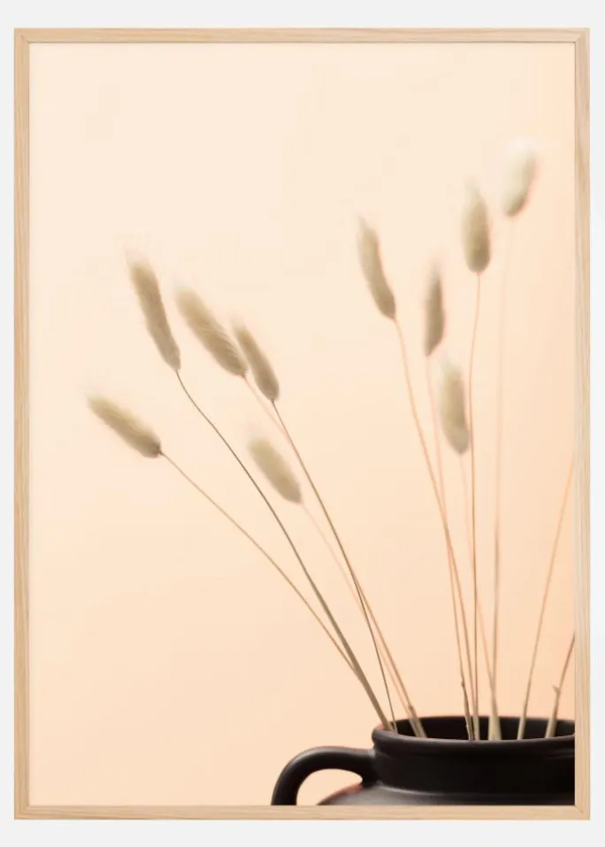 En enkel blomsterplakat med kaningræs i en kande. De lette og luftige stængler maler næsten væggen bagved, og de subtile pastelfarver vil fungere perfekt sammen med andre farver eller endda en ren hvid væg.