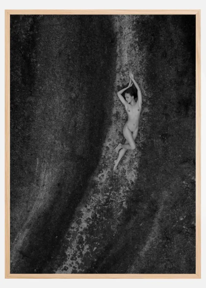 Denne unikke plakat portrætterer en tidløs sort-hvid æstetik med et motiv af en nøgen kvinde, hvis silhuet harmonisk smelter ind med den mørke og struktur-rige baggrund. Billedet, som fremhæver den naturlige skønhed og menneskekroppens former, er en hyldest til klassisk kunst og fotografisk dygtighed. De dominerende farver i motivet er forskellige nuancer af gråt, der skifter fra lys til næsten sort, hvilket skaber en stærk kontrast og en dybde, der fanger betragterens opmærksomhed.