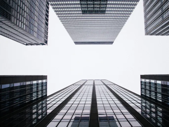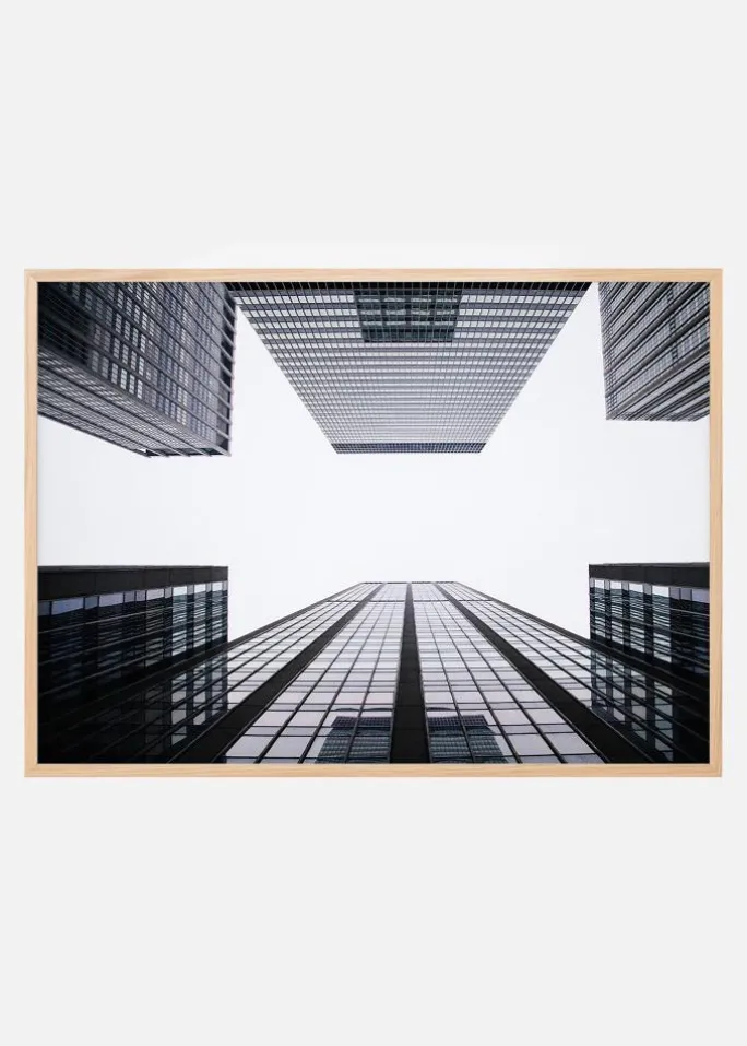 Arkitekturplakater med voksende skyskrabere mod en skyhvid himmel. Stilrent billede af mørke bygninger mod en hvid baggrund, med himlens refleksioner i glasruderne. Perfekt gave til den, der kan lide grafiske bygningsportrætter. Printet gør sig godt i en sort ramme, som forstærker det mørke i billedet og bliver fin i kombination med andre fotografier af arkitektur.