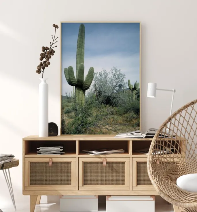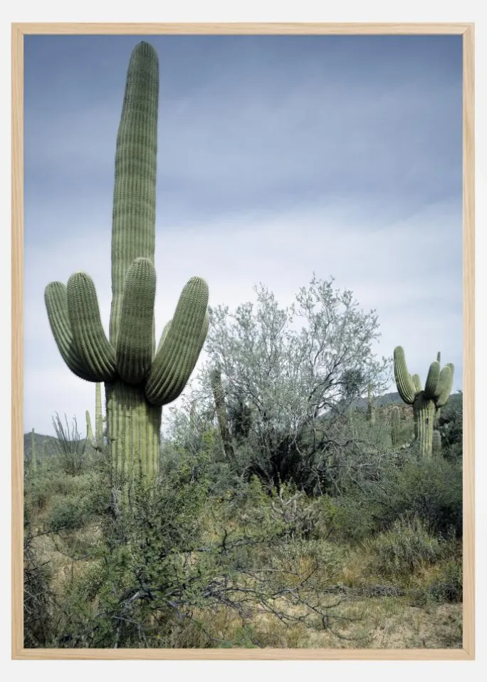 En naturplakat af en stor kaktus midt i ørkenen. En høj grøn kaktus står til venstre og rækker op mod den blå himmel. Til højre fylder grønne buske billedet og leder øjet hen til en anden kaktus og flere langt ude i det fjerne. Fordyb dig i naturen med dette ørkenbillede.