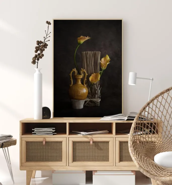 En stillebenplakat med en kande, tørrede brune stængler og tre Calla lilje blomster. En sort baggrund får den sennepsfarvede kande og de tre gule liljer til at stå stærkt frem. Den ene lilje buer op mod toppen og trækker øjet rundt på værket. Tilføj dette for et strejf af elegance i dit hjem.