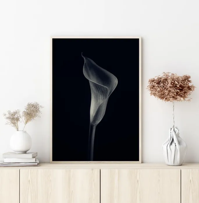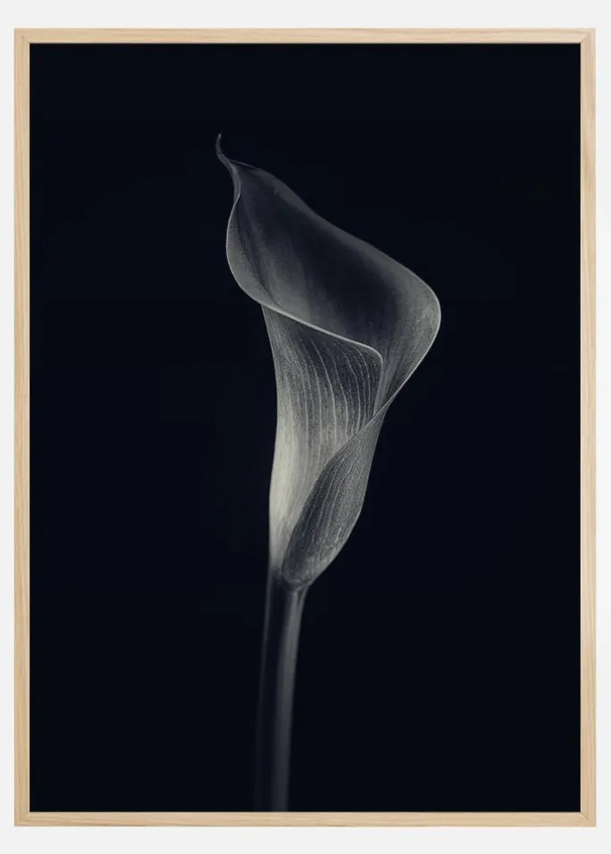 En enkelt Calla lilje plakat skaber en æterisk glød. Et omvendt negativ af denne lilje giver blomsten en mystisk kvalitet mod en sort baggrund. Dette usædvanlige foto af en Calla lilje vil helt sikkert være et samtaleemne, når du hænger det på en hvid væg for at opnå en ekstra dramatisk effekt.