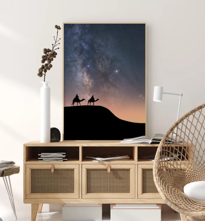 En dramatisk plakat af to kameler under en stjerneklar himmel. Mælkevejen lyser klart op, mens to kameler med ryttere i silhuet går under stjernerne i dette episke billede. Der er en blød orange solnedgang til denne scene i krybbespilsstil. Rejs til et fjernt sted, når du hænger denne magiske scene op i dit hjem.