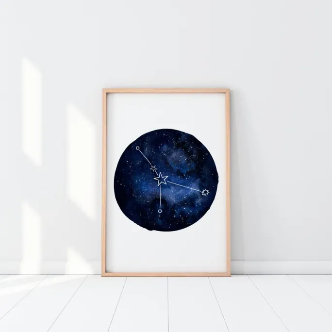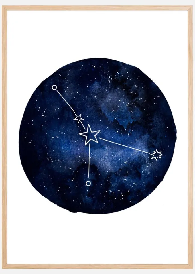 En horoskopplakat med Krebsen. En mørkeblå cirkel fylder midten af dette hvide billede. I cirklen er der forskellige blå nuancer af blå samt forskellige stjerner. Stjernetegnet Krebsen er fremtrædende i midten. Hvis du elsker dit stjernetegn, skal du sætte denne plakat på din væg.