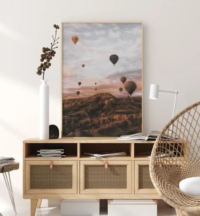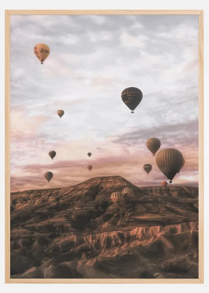En magisk landskabsplakat af Kappadokien med varmluftsballoner, der flyver hen over hovedet. Bløde lyserøde klipper er oplyst af en usynlig sol, der også giver en rosenrød glød til den overskyede himmel. Varmluftballoner svæver opad. Få en opløftende følelse, når du hænger denne op derhjemme.