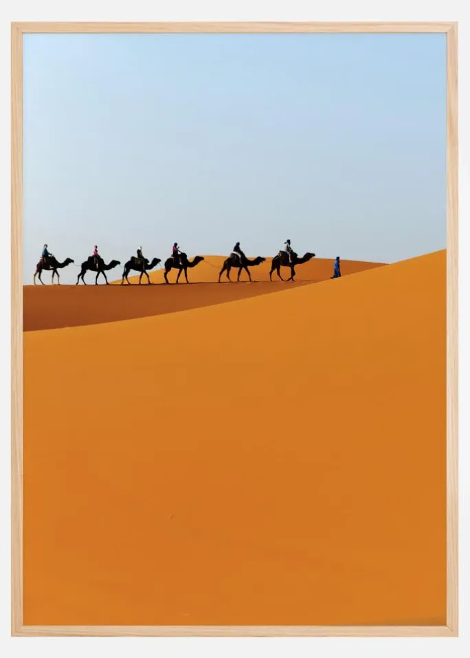 En stiliseret plakat af en kamelkaravane, der bevæger sig gennem ørkenen. Store fede orange sektioner trækker øjet hen til silhuetlinjen af seks kameler og deres ryttere, der krydser ørkenen. Nyd farvernes livlighed, når den orange ørken og den blå himmel mødes som komplementære farver.