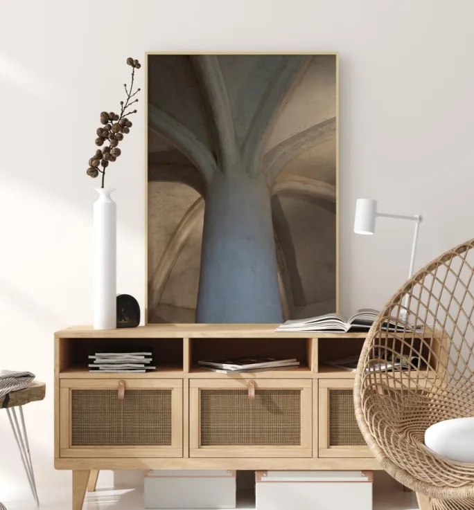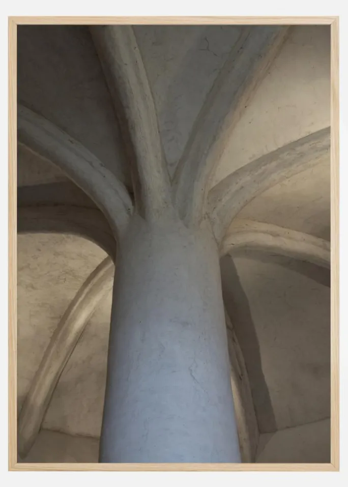 En arkitektonisk plakat af indersiden af et kapel eller kirkeloft. En enkelt søjle sidder i midten og rækker op mod loftet, hvor otte hvælvinger breder sig ud som en blomst. Den kølige sten skaber en følelse af storhed, som du kan nyde hjemmefra.