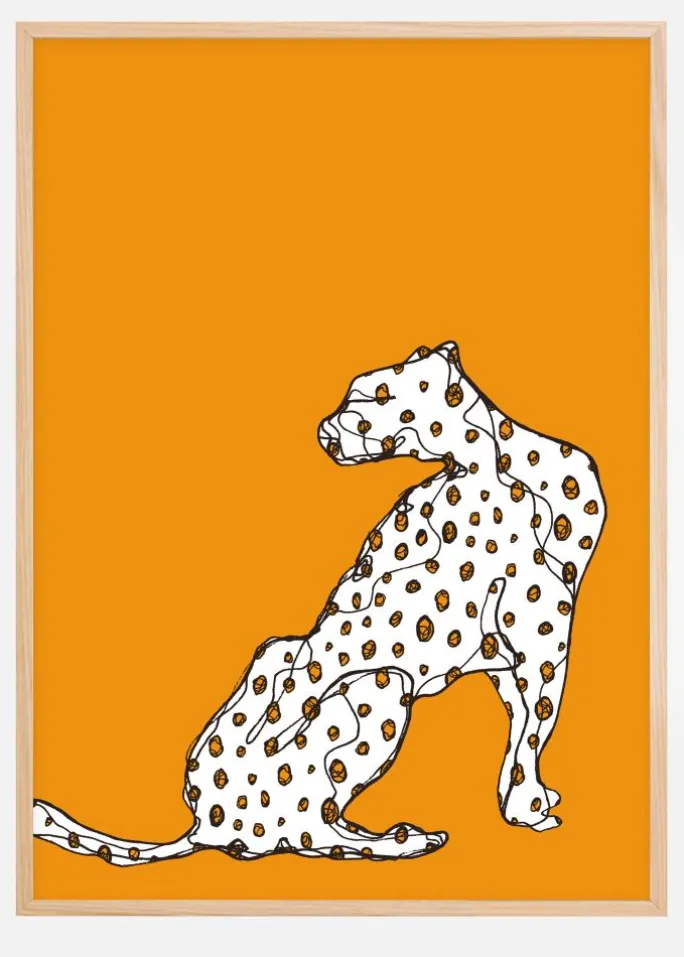 En abstrakt plakat af en gepard. Den stærke orange baggrund er med til at fremhæve de orange pletter i denne kradsede tegning af en gepard. Den siddende geparden kigger sig over skulderen og skaber bevægelse i et ellers statisk billede. Sæt dette sammen med en andeægsblå væg for at opnå en dramatisk finish.