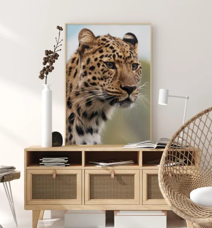 En dyrelivsplakat med et nærbillede af en leopard. Detaljerne på leoparden fremhæver pletterne, knurhårene og farverne i øjnene. Når du stirrer ud af billedet, undrer du dig over, hvad leoparden kigger på. Få den episke naturfornemmelse med denne plakat.