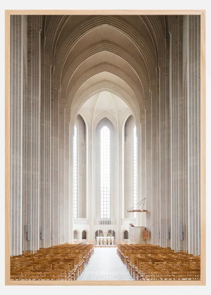 En romantisk plakat af et blødt kirkeinteriør. Lysbrune stole står langs gangen, mens høje søjler flankerer dem til hver side. De gotiske buer afgrænser stykket og leder øjet hen til det klare hvide lys for enden af kirkeskibet. Gå i kirke hjemmefra, når du hænger denne religiøse plakat op.