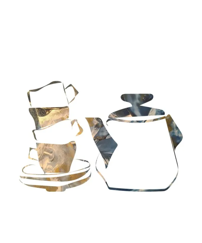 En abstrakt teplakat med kopper, underkopper og en tekande. Den er lavet af abstrakte lyserøde og blå marmorhvirvler, der er en stak tekopper og en kande klar til at blive hældt op, alt sammen på en hvid baggrund. Tilføj dette til din køkkenvæg for et sjovt, sødt og kitschet design.
