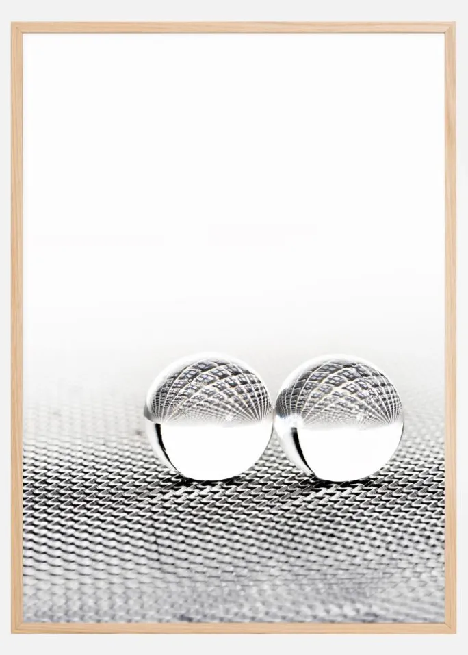 En plakat med et højt koncept af to kugler på en sølvgrill. Gitterets netværk står i kontrast til den ensfarvede hvide farve på den nederste halvdel af kuglerne. Den øverste halvdel af kuglerne afspejler nettet, men ligger ved siden af den ensfarvede hvide baggrund. Placer den på en farverig væg for at give et fedt udtryk.