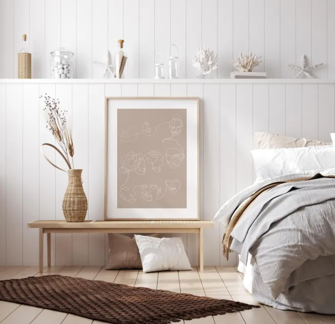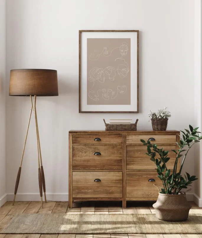 En skitsebogsplakat med en række forskellige abstrakt tegnede hoveder og ansigter. Disse abstrakte hoveder er alle tegnet med en enkelt linje, så de alle er samlet i en lang linje. De hvide linjer på den beige baggrund ville fungere sammen med en væg i en fed farve for at skabe en kunstnerisk stemning.