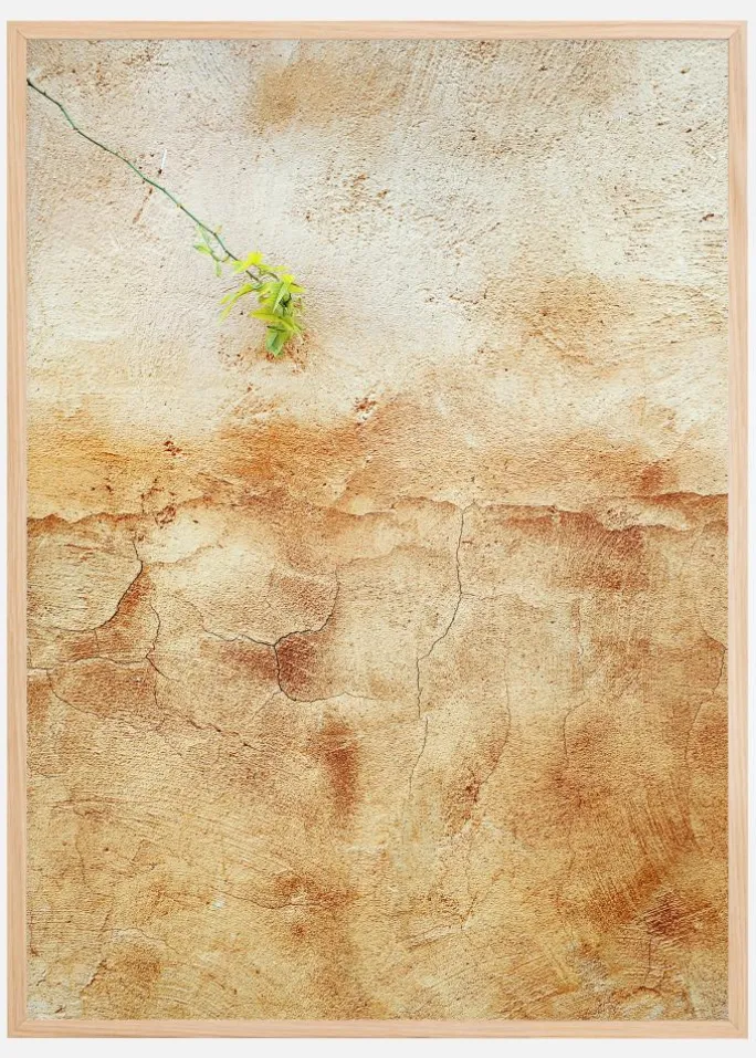En nærbillede af en revnet væg med en lille lysegrøn plante, der vokser ud af den. Væggen er blødt jordbrun, men den tynde grønne revne og den lyse plante står i modsætning til den bløde jordbrune farve. Lad dit øje vandre, indtil det finder alle de mærkelige revner i denne teksturelle overflade. Sammensæt dette med en væg i samme farve for at opnå den bedste illusion.