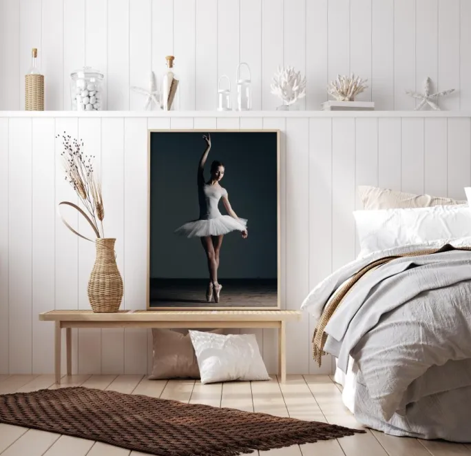 En fotografisk plakat af en graciøs balletdanserinde stående på tå med den ene arm strakt op over hovedet. Lysopsætningen i billedet gør, at hendes ansigt og hvide tøj kontrasteres fint mod den lidt mørkere omgivelse