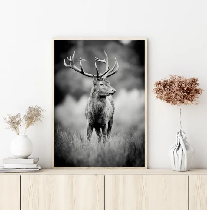 En vildtplakat af en hjort med gevir i sort/hvid. Vignetten får det til at føles, som om du betragter ham gennem en kikkert på afstand, som du ville gøre det i naturen, hvilket gør denne scene endnu mere speciel. Hans drejede hoved betyder, at han ser tilbage på dig og trækker dig ind i billedet.