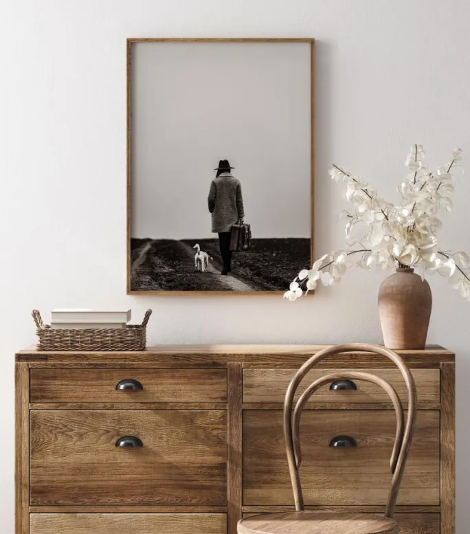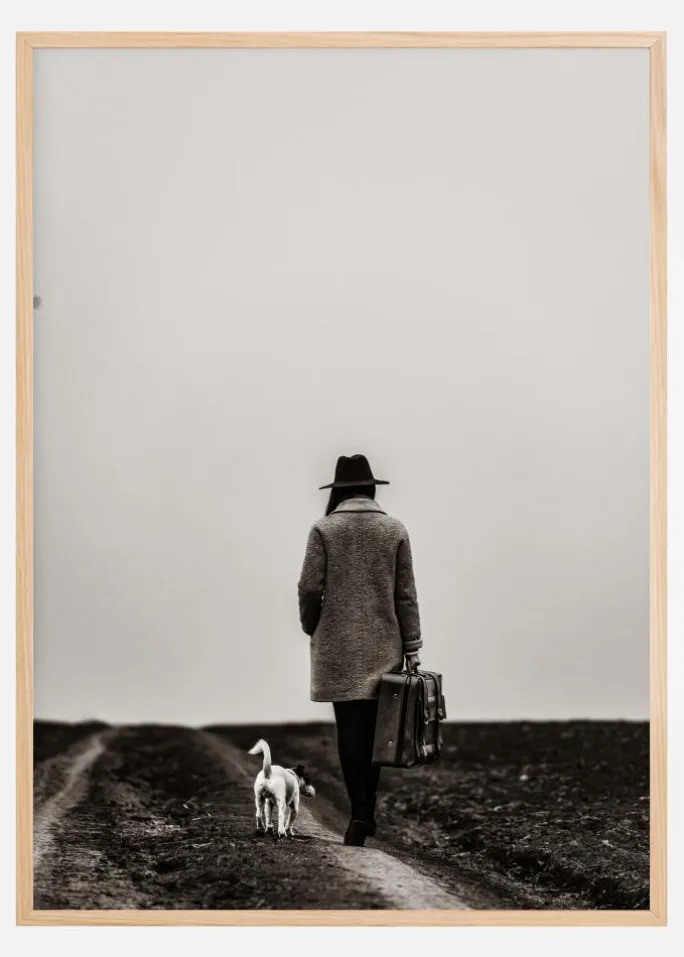 En minimalistisk plakat af en kvinde, der går langs en sti med sin hund. Den tosporede sti fører ud i det fjerne, mens kvinden iført en lang jakke bærer en kuffert sammen med sin terrier. Den brede hvide himmel er indbydende. Følg denne kvinde på hendes rejser, når du tilføjer dette sort/hvide billede til din væg.