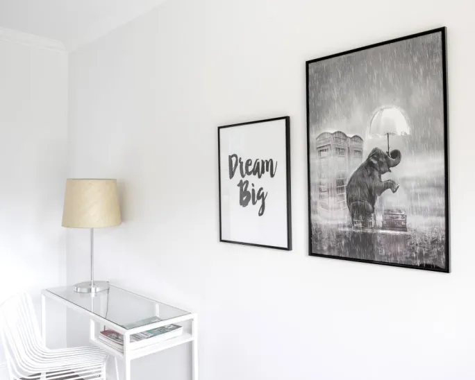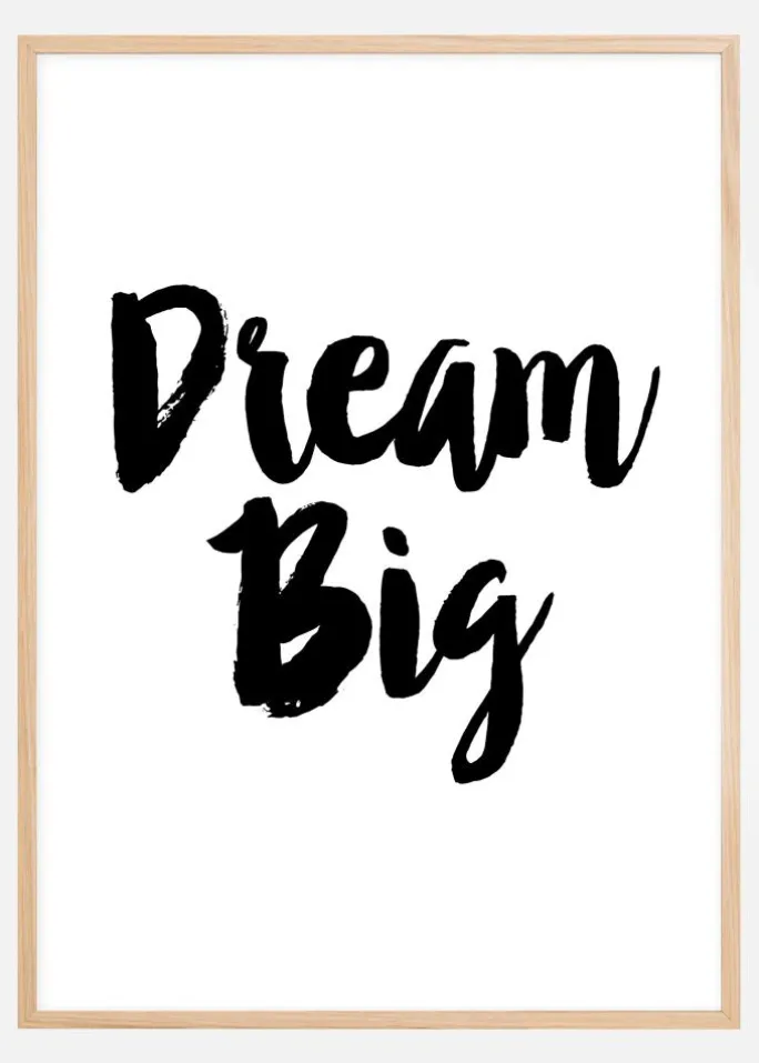 Den eneste, der virkelig kan stå i vejen for dine drømme, er dig selv. Ændr din indre stemme og mind dig selv om, at du faktisk må (og bør) drømme store drømme med denne fine plakat! Printet har et stilrent og enkelt design med teksten ”Dream Big” i sort mod en hvid baggrund. Overvej gerne at supplere med en sort eller hvid passepartout og en farverig ramme. Vælg mellem 6 forskellige formater.
