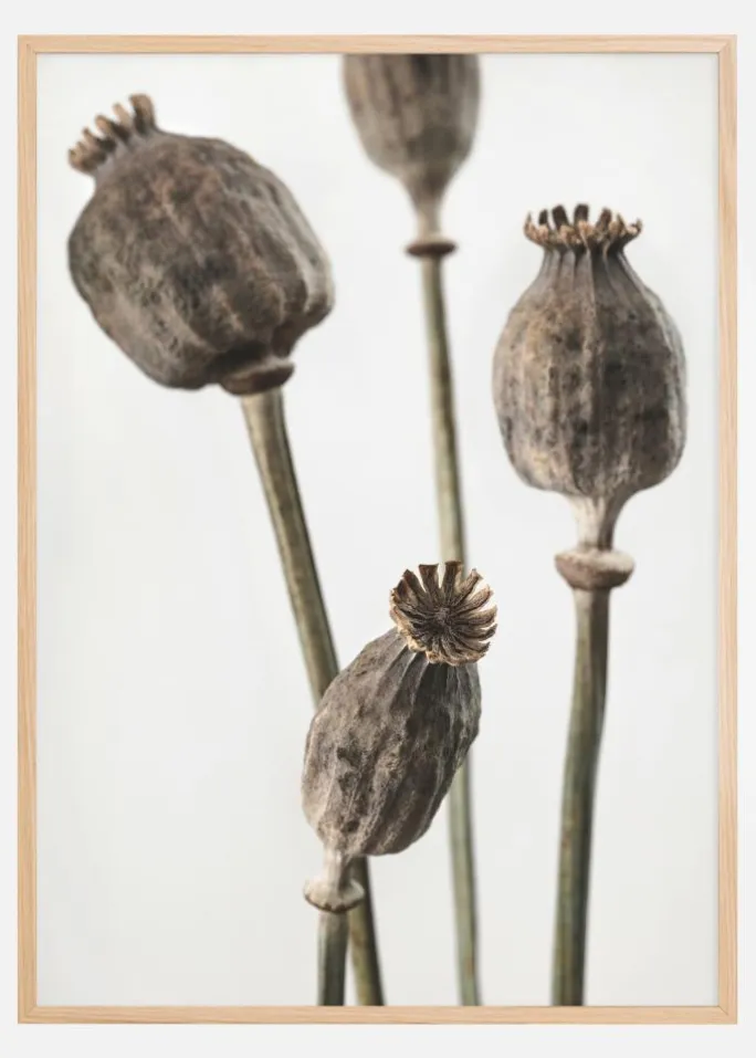 Denne kunstnerisk udførte plakat fokuserer på den rustikke skønhed hos tørrede valmuekapsler. Dens detaljerede fremstilling fremhæver de skulpturelle former og de jordagtige toner, hvilket skaber en følelse af dybde og tekstur. De neutrale farver og den enkle baggrund fremhæver hver valmuekapsels unikke form og skønheden i deres forgængelighed.