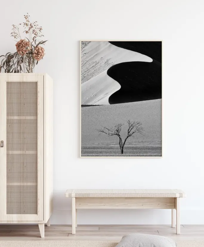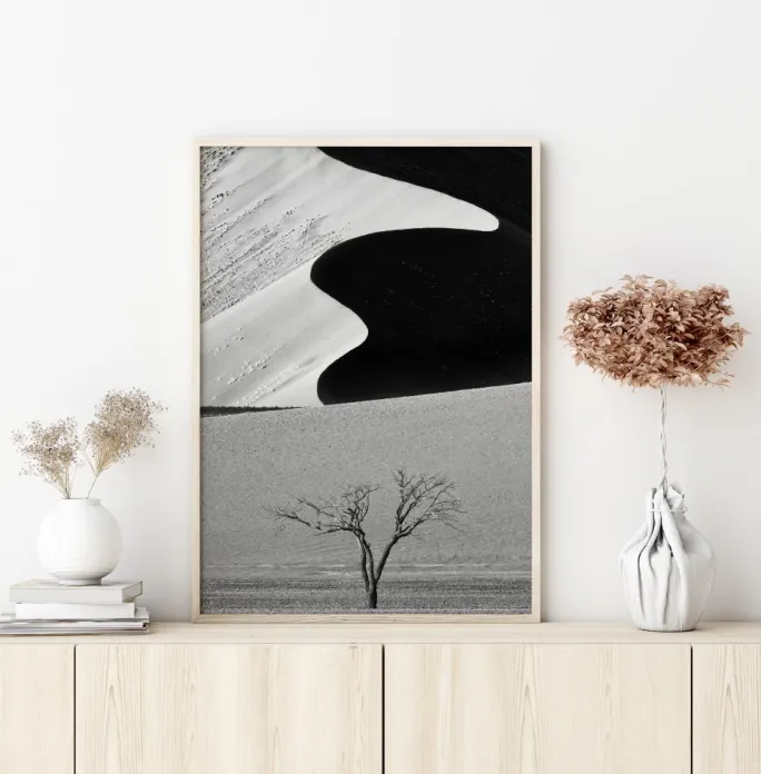 En dramatisk plakat med bølgende klitter og et ensomt træ. Dette skarpe billede sætter klitternes sorte og hvide kurver op mod træets statiske stilhed. Skab en ærefrygtindgydende stemning med dette værk.