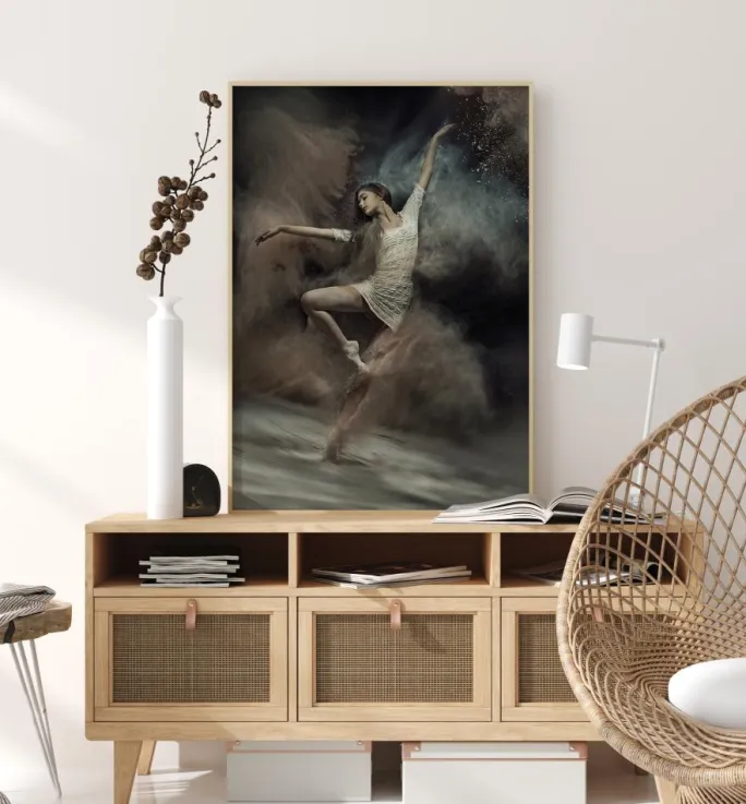En actionplakat af en fantastisk balletdanser i midterposition. Den atletiske pige er iført hvidt og vrider sig smukt for at skabe bevægelse. I baggrunden er der bløde skyer i sepia- og pastelfarver for at skabe et blødt look. Fortab dig i magien i dette elegante stykke.