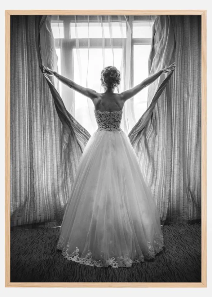 Denne smukke sort-hvide plakat fanger et intimt øjeblik med en brud på hendes bryllupsdag. Hun står med ryggen vendt mod betragteren, draperet i sin brudekjole, med armene udbredt mod vinduets gennemsigtige gardiner. Lyset, der strømmer ind gennem vinduet, oplyser hendes silhuet og giver hendes kjole en eterisk glød.