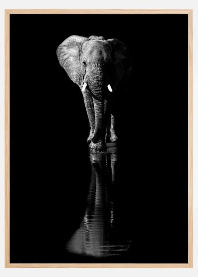 En imponerende plakat med en elefant, der kommer ud fra den sorte baggrund. Dette fantastiske billede viser en skyggefuld elefant og spejlbillede. Skab en atmosfære af drama og mystik i dit hjem med denne plakat.