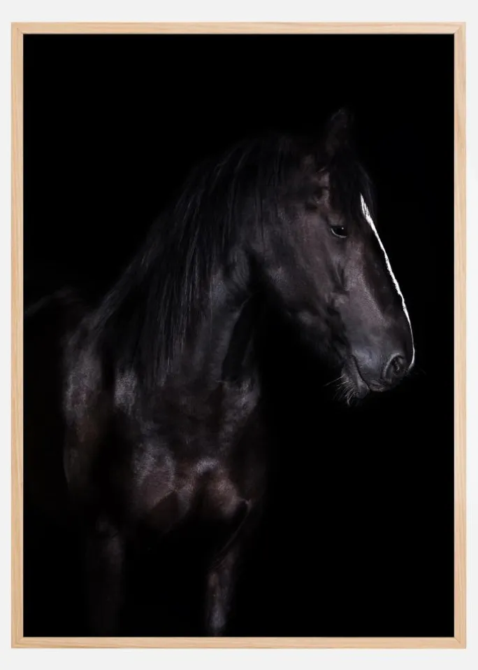 En storslået plakat af en shirehest. De stærke linjer på dette imponerende dyr fremhæves af usynligt lys. Selv om den er sort på en sort baggrund, skiller hestens profil sig ud på grund af den hvide blus på hans næse. Det perfekte print til enhver hesteelsker.