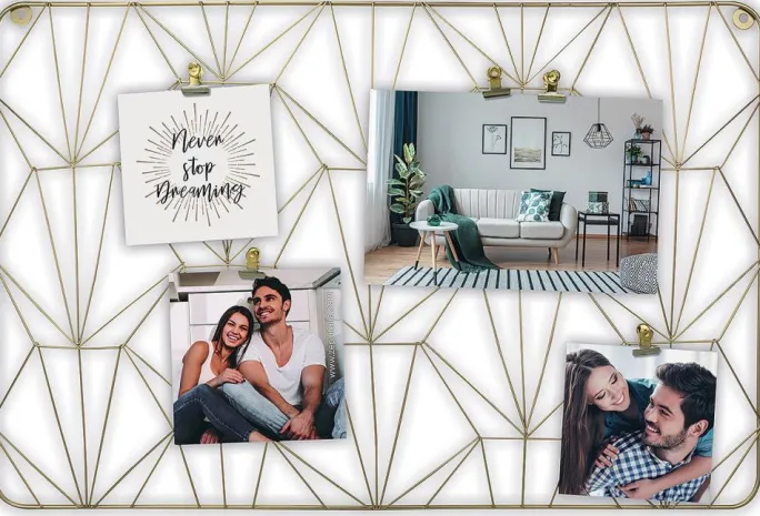 - Designet som en opslagstavle, billeder fæstnes med clips
