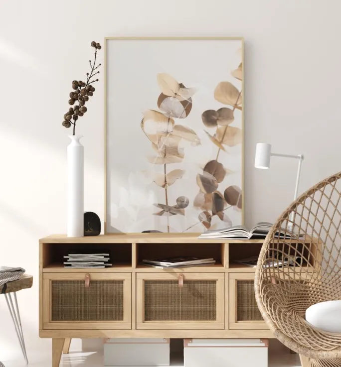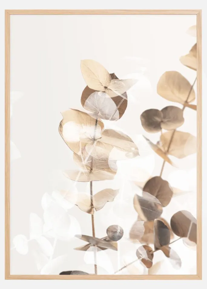 En gylden plakat med eukalyptusblade og -grene. De gyldne og brune blade står frem i skimrende form mod den enkle hvide baggrund. Hvis du vil gøre bladene stærkere, kan du matche dem med en lignende væg i guld eller mørk creme for at give dem ekstra elegance.