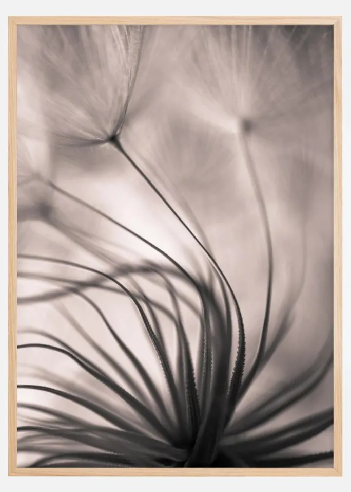 Denne delikat komponerede plakat viser en blomsts silhuet med et drømmende fokus, der giver billedet en blød og æterisk kvalitet. De subtile toner af sepia og blødt gråt skaber en beroligende og næsten meditativ atmosfære. De tynde linjer af blomstens stilke og frø fremstår elegant mod den slørede baggrund, hvilket fremkalder følelser af ro og stilhed.