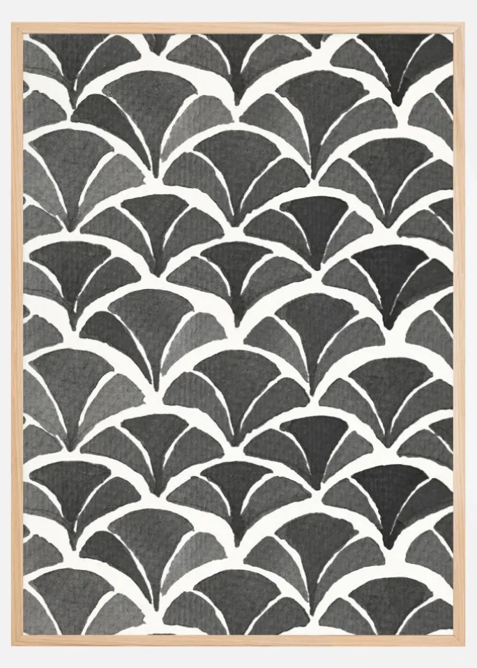 Giv dit rum et strejf af kunstnerisk elegance med denne plakat, der har et fængslende mønster af bladfjer i sort og hvidt. Denne tryksag har et gentagende mønster, der minder om vintageventilatorer, som er arrangeret rytmisk over hele overfladen for at skabe en følelse af bevægelse og symmetri. Den stilrene kontrast mellem det sorte og det hvide giver et klassisk look, der passer ind i mange forskellige indretningsstile og miljøer.