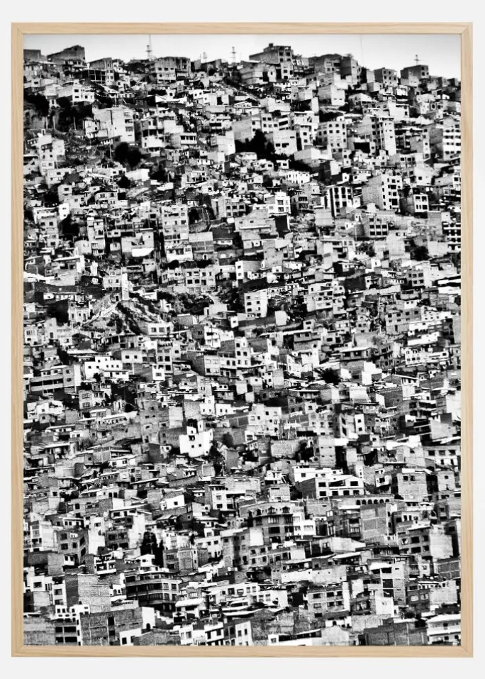 En plakat med et bybillede af hundredvis af små huse i El Alto La Paz-favelaen i Bolivia. Billedet er fyldt med husenes hvide facader og deres åbne sorte vinduer, hvilket skaber et travlt, men fascinerende billede. Fortab dig i labyrinten af huse, når du tager denne med hjem.