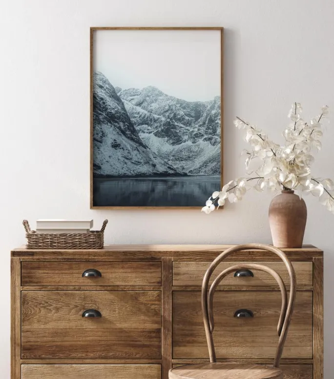 En dramatisk plakat med snedækkede bjerge, der fører ind i stille vand. En glat sø eller måske en fjord strækker sig ud med de sneklædte bjerge, der møder den foran. En klar hvid himmel er med til at skabe en atmosfære af vinter. Bring det kolde vejr indenfor, når du hænger dette værk op.