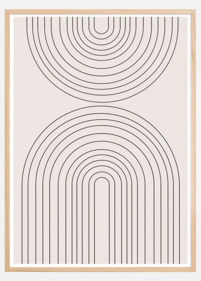 Denne elegant designede plakat præsenterer en indviklet og hypnotiserende serie af sammenflettede buer, der danner to distinkte halvkugle-former. Med en sofistikeret og minimalistisk æstetik, er linjerne udsøgte og præcist placeret mod en beroligende, neutral baggrund, hvilket gør den til en perfekt baggrund for en moderne og trendy indretning. Dens diskrete farvesætning i sort på off-white gør det nemt for kunder at finde og matche denne print med forskellige farver og møbler.