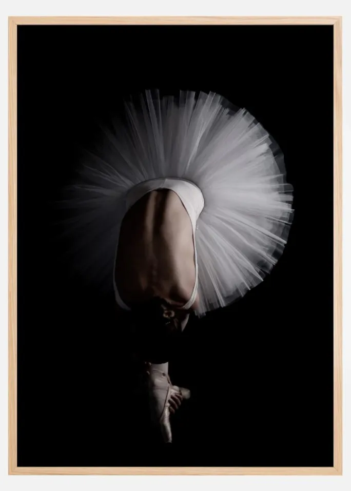 En dramatisk luftplakat af en balletdanser, der bøjer sig fremad for at nå sine sko. Den mørke, sorte baggrund får hendes hvide tutu til at springe frem i en lys cirkel omkring hende. De stærke linjer på hendes ryg fører øjet hen til de elegant spidse fødder. Elegance og dramatik forenes i dette enkeltstående billede.