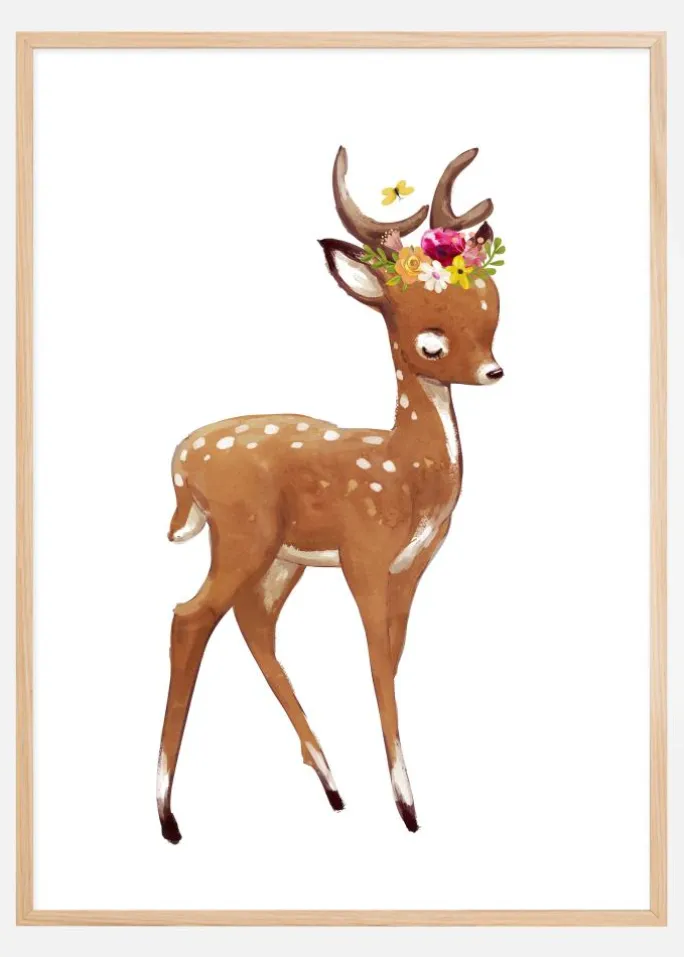 Den detaljerige blomsterkrans med sine levende farver giver en smuk kontrast mod rådyrets jordnære farveskala og tilfører en romantisk følelse til motivet. Denne print er perfekt til at skabe en rolig og imødekommende atmosfære i hvert rum, fra stue til soveværelse eller børneværelse. Med dens klassiske skønhed og tidløse charme vil denne plakat være et værdsat tilskud i enhver boligindretning.