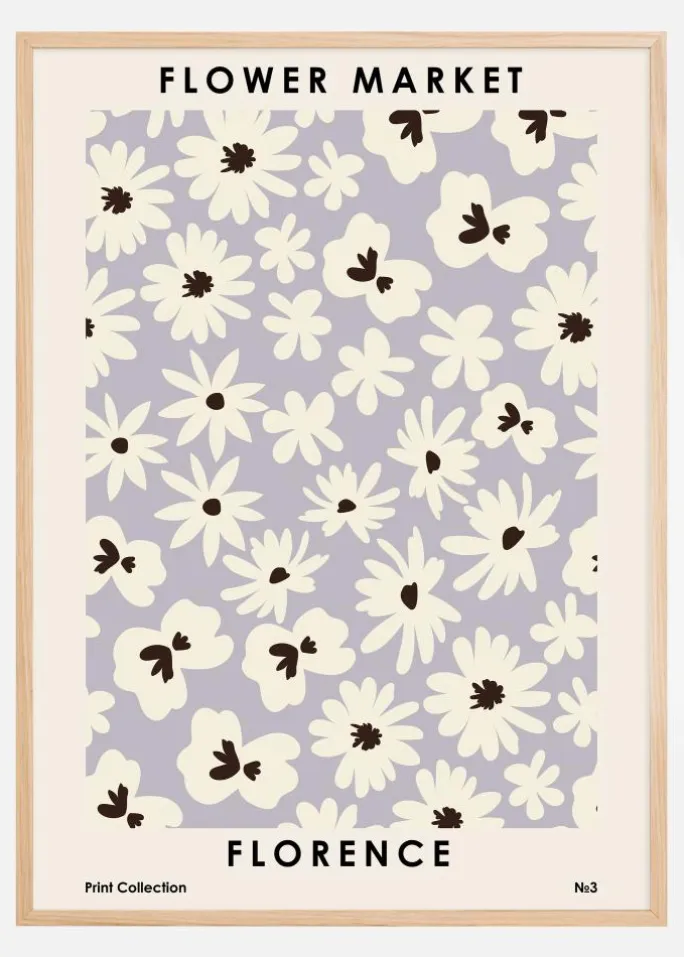 Den stilfulde tekst “FLORENCE” sammen med “Print Collection ?3” nederst på plakaten, giver en følelse af eksklusivitet og autenticitet. Dette print er en ideel vægdekoration for den, der ønsker at bringe en del af Italiens renæssanceby og dens passion for skønhed og natur ind i sit hjem. Farverne i motivet – sprødt hvidt, dybt sort og nuancer af gråt – er nøje udvalgt for at reflektere Firenzes historiske og æstetiske charme.