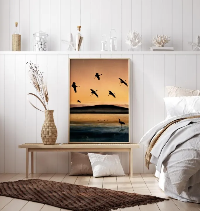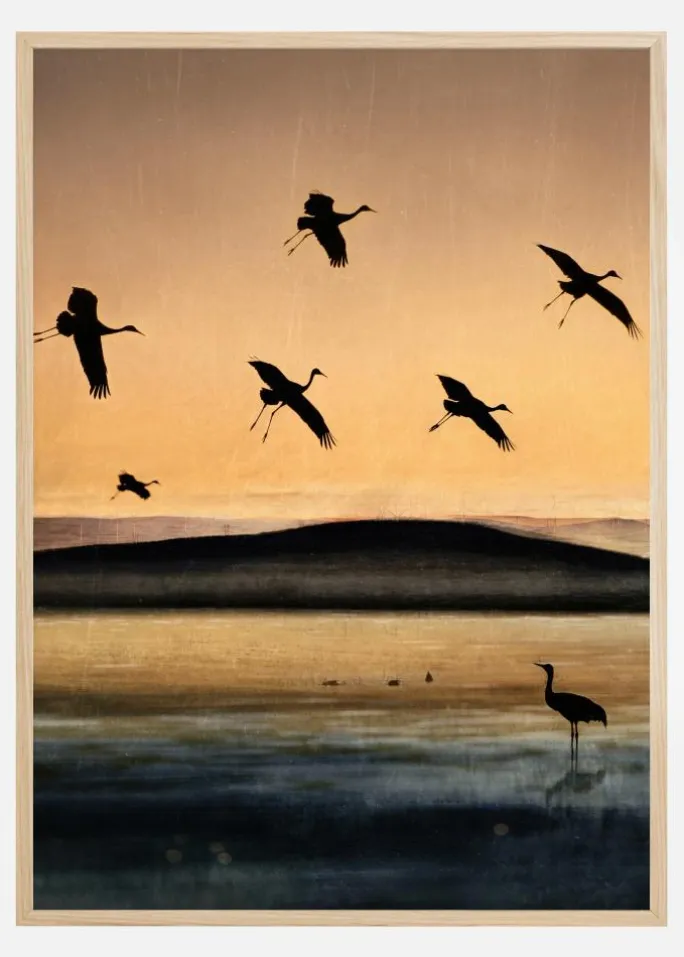 En stemningsfuld plakat med fugle, der flyver ved solnedgang. Seks storke tager flugten, og deres silhuetter er tydelige mod den orange himmel og den nedgående sol. En ensom fugl står i den blå og gyldne sø og ser op på resten, mens de flyver væk. Føl flyvningens fred i denne varme plakat.