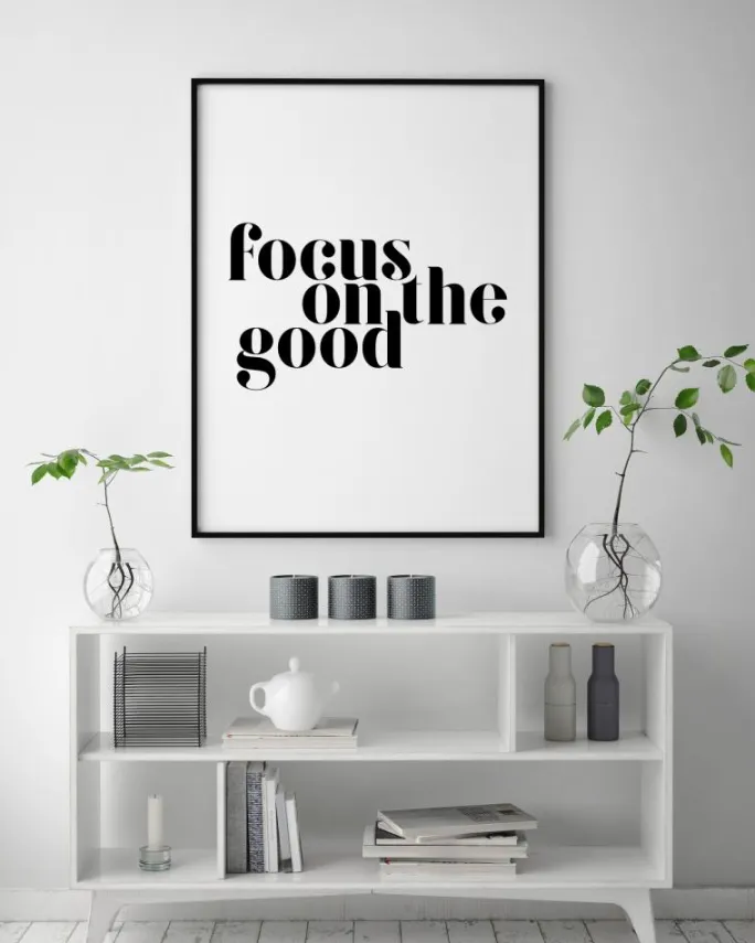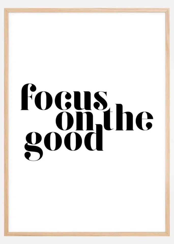 En motiverende plakat, der opmuntrer læseren til at have positive tanker. Fokus på det gode er nøgleordet her, og det er skrevet med fed skrift på en ren hvid baggrund. Start dagen rigtigt med denne eftertrykkelige og meget nyttige sætning.