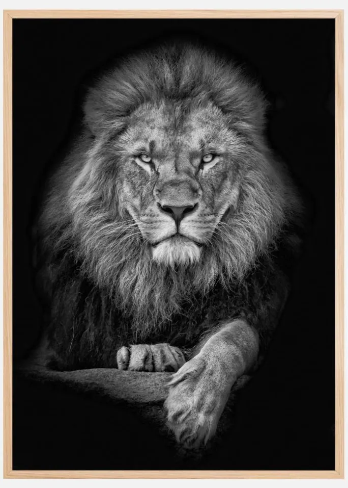 Et sort-hvidt nærbillede af en løve, der kigger direkte på beskueren. Den mørke baggrund og det intense blik skaber en dejlig tiltrækningskraft til billedet. Dette er en plakat, der gør sig lige så godt alene som sammen med andre favoritter i et større collage.