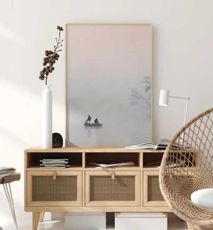 En magisk plakat af to mænd, der fisker i en båd en tåget morgen. Den lille båd ligger til venstre i silhuet. Trægrene kan ses til højre, men alt er indhyllet i et kraftigt tæppe af hvid tåge, hvilket gør dette til et mere magisk billede. Nyd freden tidligt om morgenen med denne plakat.