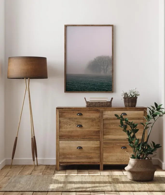 En lys plakat af en mark og træer i den tidlige morgentåge. Man kan se den opgående sol, der bringer lysstyrke til billedet og lyser op i det grønne på marken og brænder tågen væk. Tågetræer fylder baggrunden og tilføjer til denne meget britiske morgenscene.