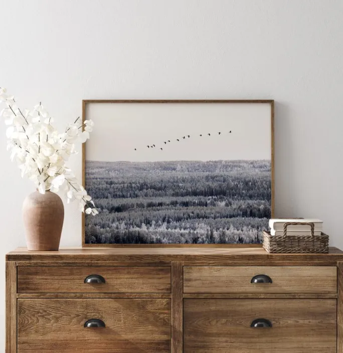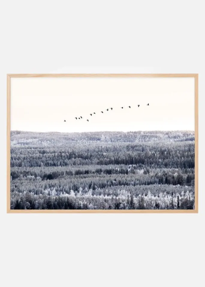 En fotografisk plakat over en flok med trækfugle, der flyver højt over trætoppene. Den vidstrakte skov går i kølige farvetoner under en hvid himmel. En plakat, der ånder en herlig følelse af frihed.