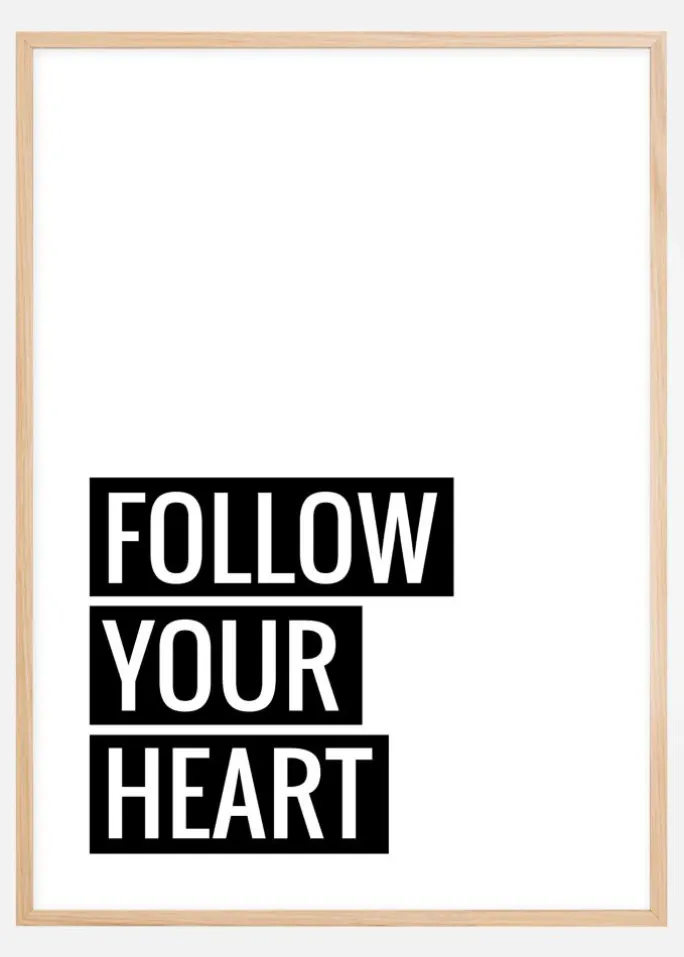 Vi støder gang på gang på forskellige vejkryds i livet, hvor det kan være meget svært at træffe en beslutning. Da gælder det om at lytte indad og følge sit hjertes kloge stemme. Denne stilrene plakat opfordrer dig til netop det. Posteren er hvid med teksten ”Follow your heart” i hvidt mod en sort baggrund. Vælg mellem 6 forskellige spændende formater og kompletter med en ramme og en passepartout efter smag. Placer derefter plakaten godt synlig, så den kan guide dig gennem hver dag.